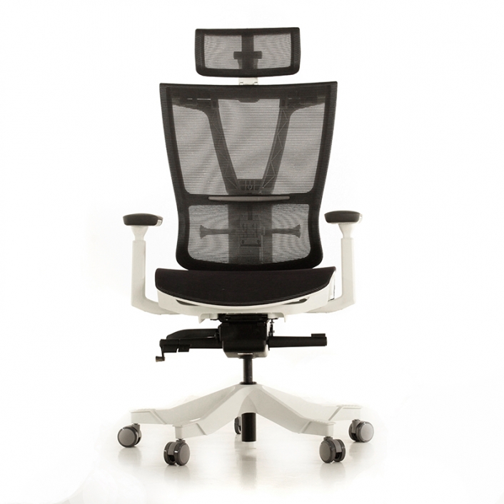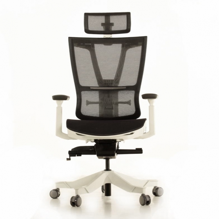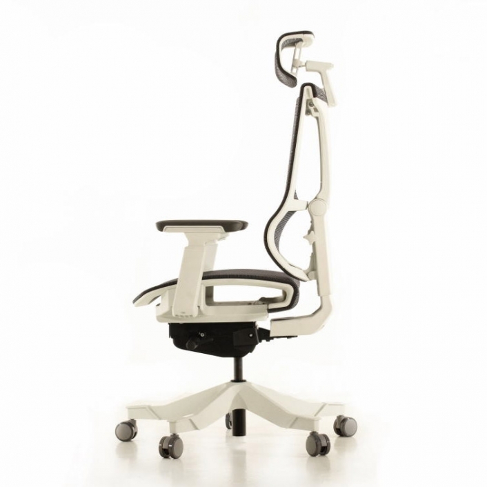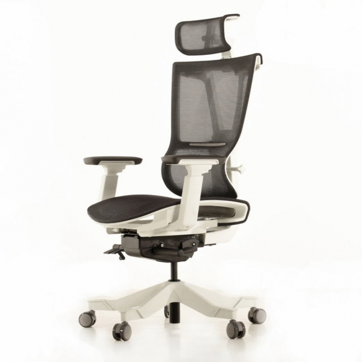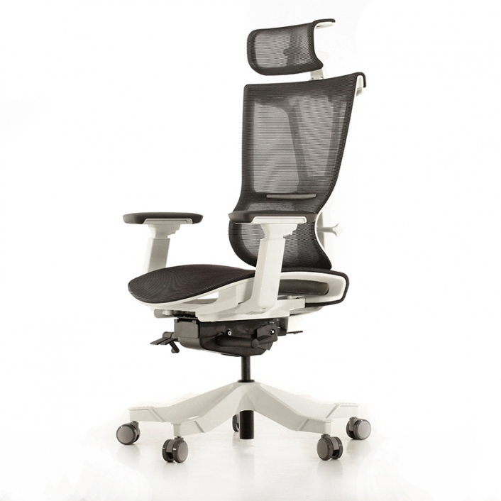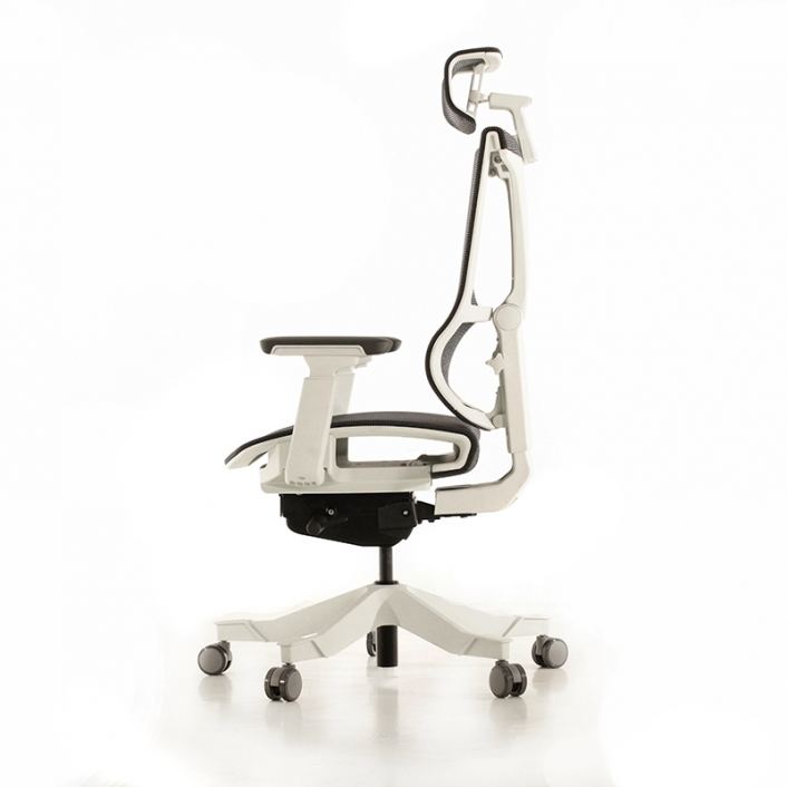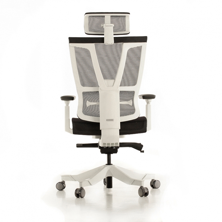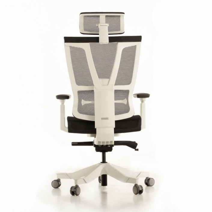 Rangka kursi berwarna hitam dan putih; sandaran, dudukan dan headrest dari bahan jaring (German Krall+Roth mesh) berwarna hitam untuk menunjang postur dan kenyamanan pemakai.