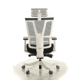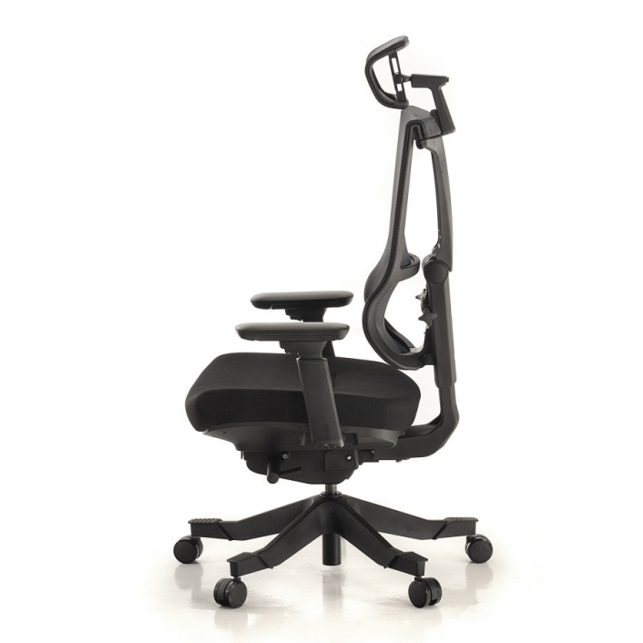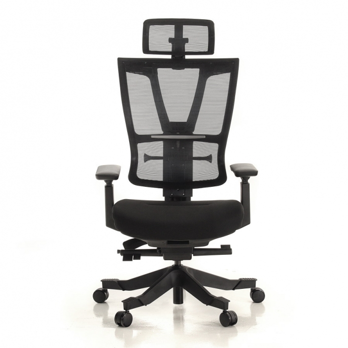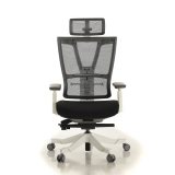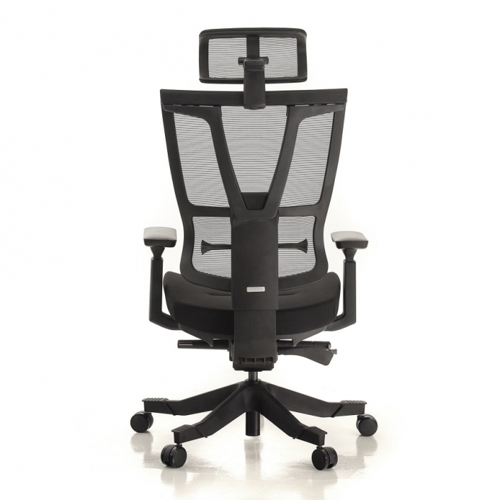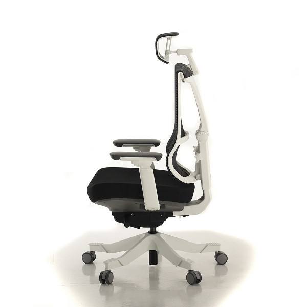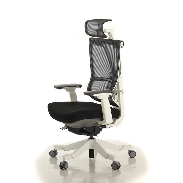 Rangka kursi berwarna hitam dan putih; sandaran dan headrest dari bahan jaring (German Krall+Roth mesh) berwarna hitam untuk menunjang postur dan kenyamanan pemakai, dudukan dari foam bungkus kain warna hitam.