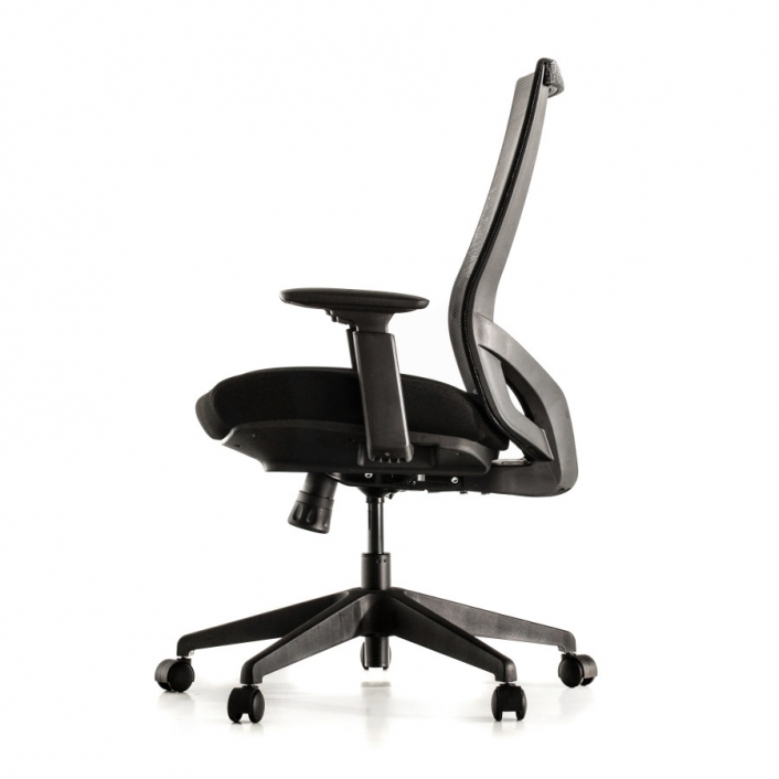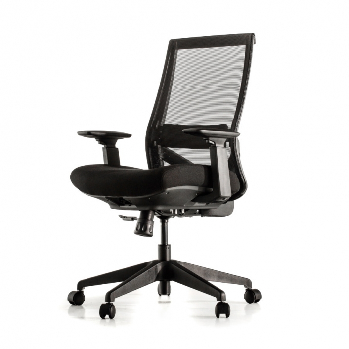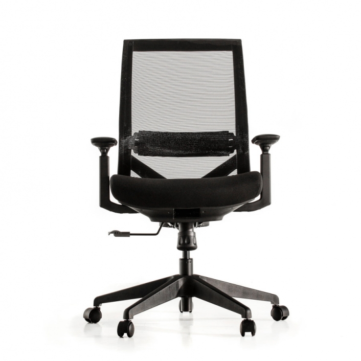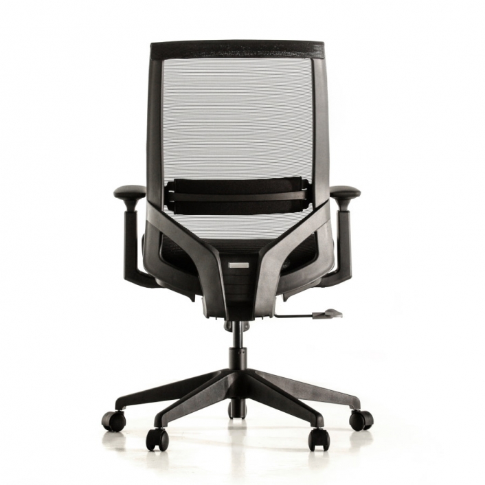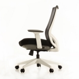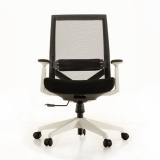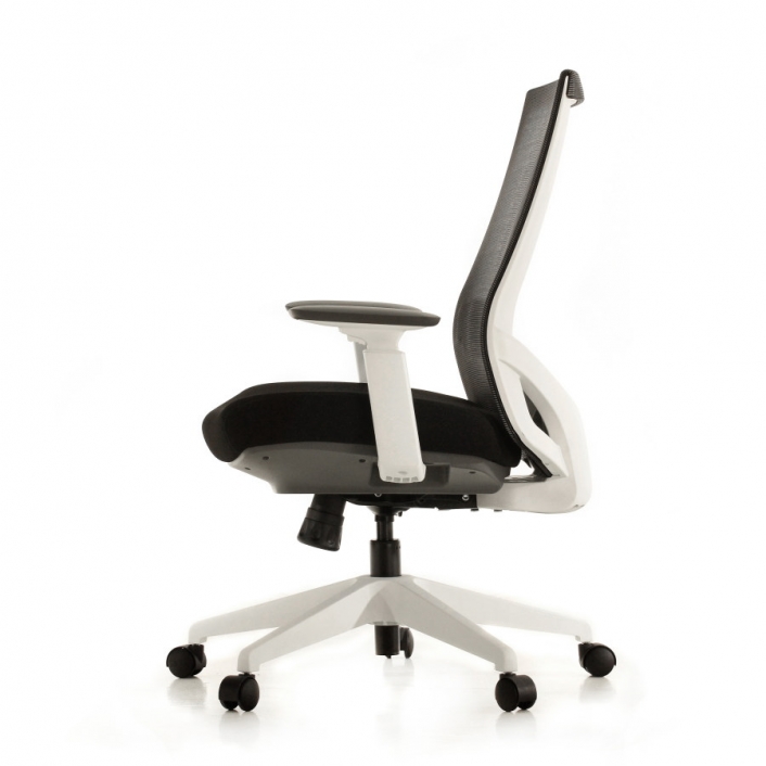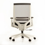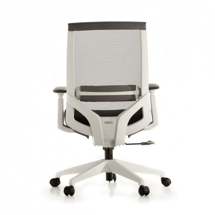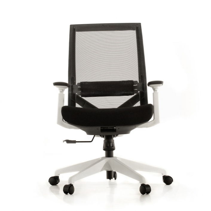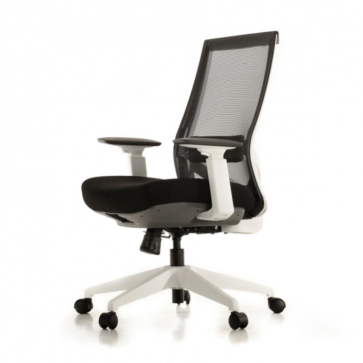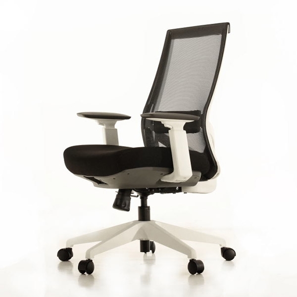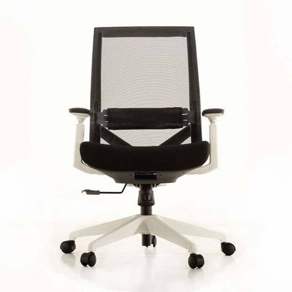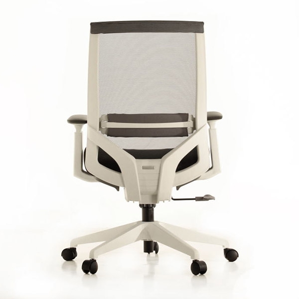 Rangka kursi berwarna hitam dan putih; sandaran dari bahan jaring (mesh back) berwarna hitam yang menunjang postur dan kenyamanan pemakai. Dudukan terbuat dari bahan busa berkwalitas dibungkus kain warna hitam.
